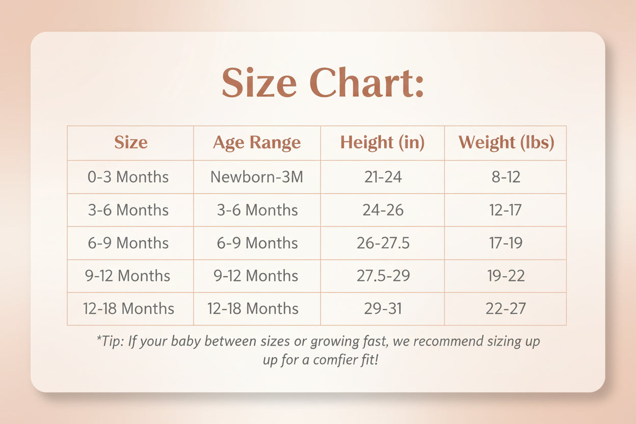 Tip: If your baby is between sizes or growing fast, we recommend sizing up for a comfier fit!